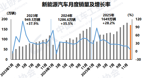 2025年9月,工信部等八部门聚拢发布《汽车行业稳增长使命有筹算(2025—2026年)》提倡,2025年力图达周至年汽车销量3230万辆阁下,同比增长约3%;其中新能源汽车销量1550万辆阁下,同比增长约20%。如今,这一销量办法得以高质料完成。