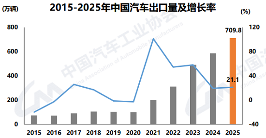 值得一提的是,2025年中国汽车出口保捏高速增长态势,其中汽车出口达到709.8万辆,同比增长21.1%,成为中国汽车阛阓保捏正增长的主要推能源之一。