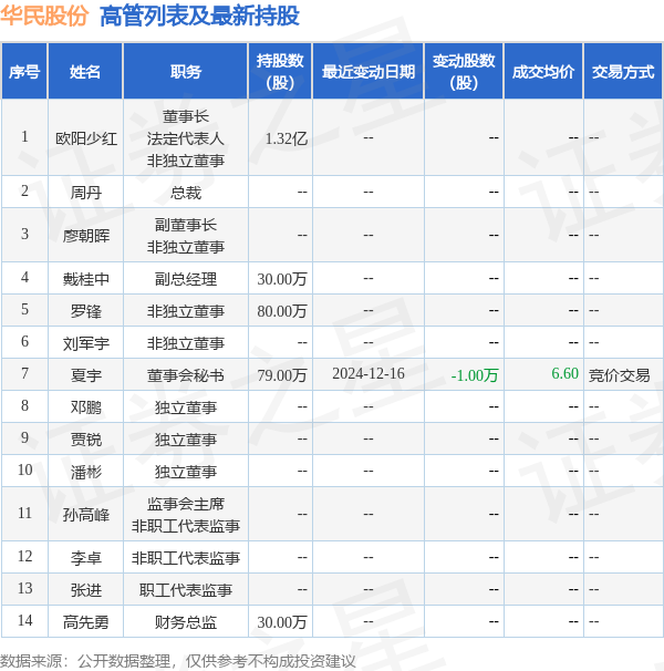 华民股份的高管列表及最新捏股情况如下: