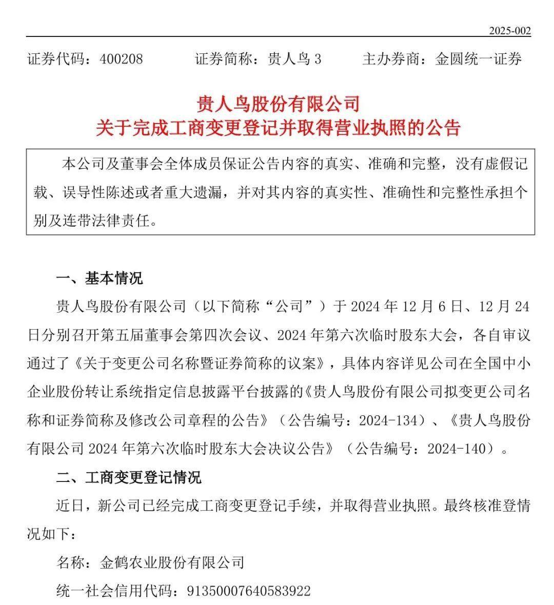 公告透露,近日,新公司也曾完成工商变更登记手续,并获取营业牌照,称号已变更为金鹤农业股份有限公司。