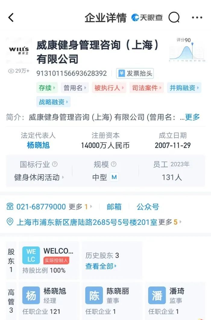天眼查APP清晰,威尔仕健身关联公司为威矫健身治理参议(上海)有限公司,注册本钱为1.4亿元东谈主民币。本年7月31日,该公司法定代表东谈主从张立变更为杨晓旭。单11月26日一天,威矫健身治理参议(上海)有限公司就新增了10条看成被告的管事公约纠纷开庭公告。