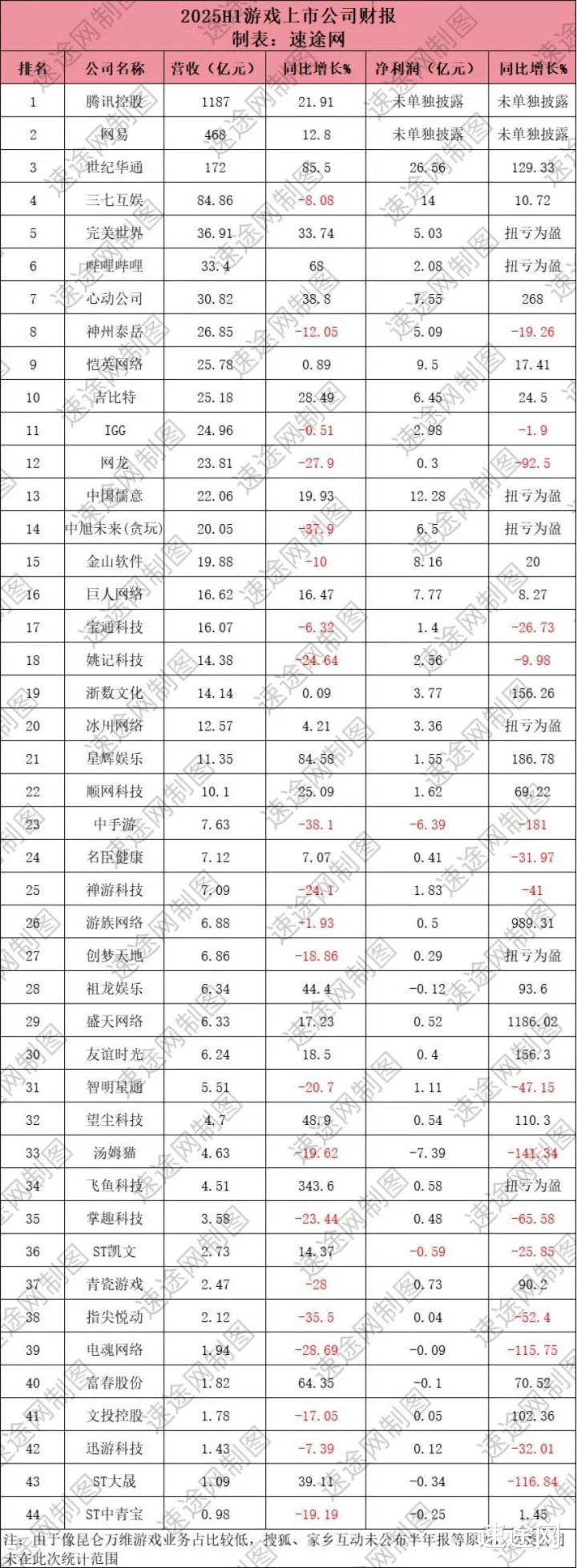 2025年8月下旬起,中国游戏上市公司接续泄漏2025年半年报。在行业政策放宽、用户增长放缓、工夫迭代加快的布景下,各大游戏上市公司功绩呈现显赫分化——既有依托爆款或多元化布局结束增长的“黑马”,也有受困于单一IP依赖或转型阵痛的“掉队者”。速途网结合已发布的财报数据及行业动态,梳理了头部企业的业务能力与过去发展趋势,望望游戏行业在2025年上半年到底证据如何?又有哪些财报数据背后的训戒值得咱们参考模仿?
