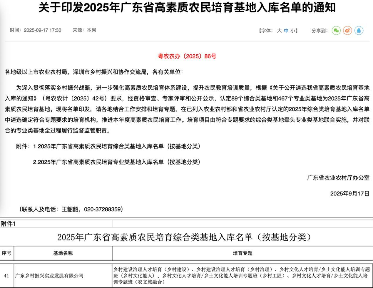 近日,广东省农业农村厅公布《2025年广东省高修养农民栽种基地入库名单》,广东乡村振兴实业发展有限公司登榜。