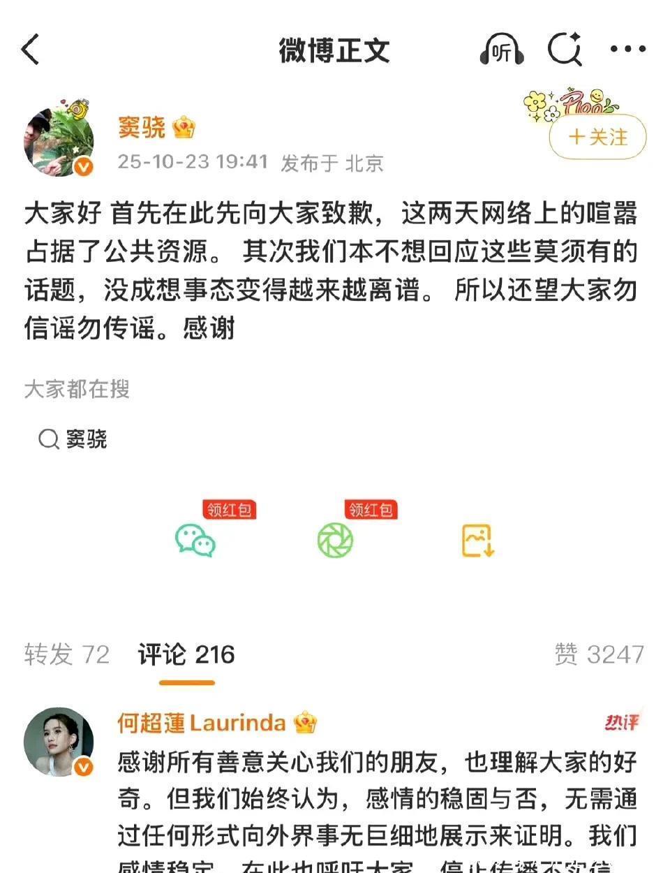 随后,多样爆料和臆测如潮流般涌来,有东谈主说窦骁为了婚典破钞积聚,有东谈主传两东谈主因婚前公约产生矛盾,致使还有东谈主曝光所谓的“区别费8000万”。更有甚者,网友们还从窦骁的豪迈平台动态中寻找蛛丝马迹,比如他改回微博简介,清空合照,这些皆被视为婚变的“实锤”。濒临愈演愈烈的传奇,窦骁和何超莲并莫得坐视无论。10月23日,窦骁当先发文,申斥这些传奇“莫须有”,号令全球不要再信讹传谣。何超莲也就地转发撑握,表态两东谈主厚谊结识,无需向外东谈主证据注解。