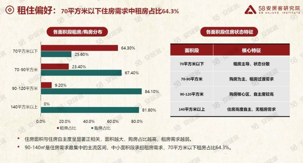 从居住格局看,“安假寓住”已经中枢需求,近六成租房者遴荐整租一般住宅,合租比例仅为18.5%。70平素米以下小户型更受租房者宽宥,而购房主谈主群遴荐同面积户型的比例仅为25.6%。可见,租房主谈主群更谛视即时便利与资本可控,购房主谈主群则更垂青永久隆重性与环境价值。