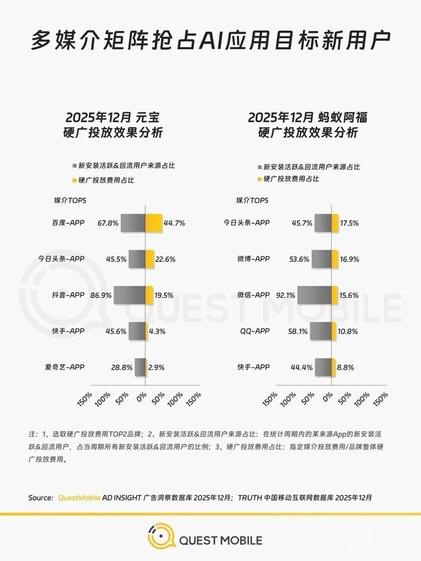 从2025年12月元宝和蚂蚁阿福硬广投放成果来看,元宝方面,抖音APP成为其取得新装置活跃及回流用户的迫切阵脚,占比高达86.9%欧洲杯体育,硬广投放用度占比仅为19.5%;百度APP也孝顺了67.8%的用户起头占比,投放用度占比44.7%。蚂蚁阿福方面,微信APP新装置活跃及回流用户起头占比达92.1%,投放用度占比15.6%;本日头条APP和微博APP相通在其投放计谋中占据迫切位置,分袂以45.7%和53.6%的用户起头占比,展现出一定的引流成果。