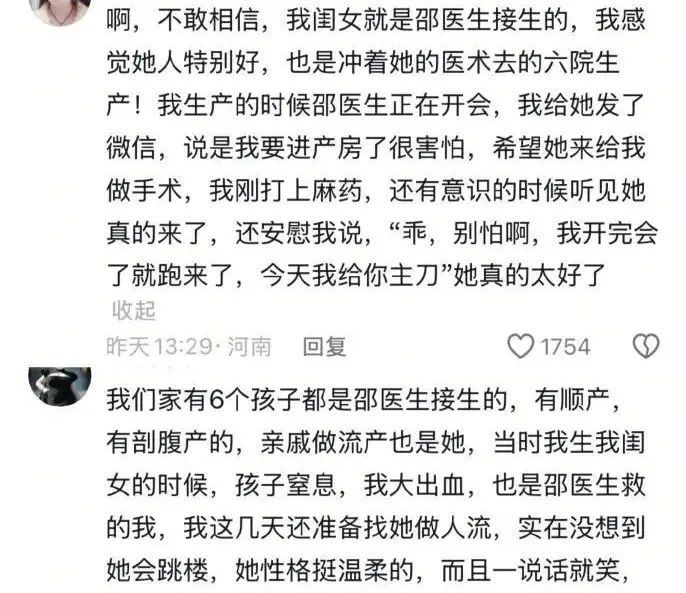 也有网友留言称,邵大夫东谈主相配好,其时她胎盘低大出血入院,邵大夫一直捏着她的手抚慰,思着生二胎还去找邵大夫,知谈邵大夫厌世真实相配痛楚。