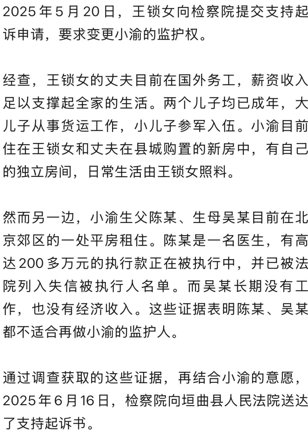 2025年7月14日,法院作出判决,取销陈某、吴某的监护东谈主履历,并指定王锁女为小渝的监护东谈主。当天地午,垣曲县公安局就简化历程,将小渝户口登记在王锁女方位乡派出所的集体户。此外,小渝还有个亲妹妹也雷同被弃养给了保姆,当地张望机关也在积极履职,匡助其科罚户口问题。
